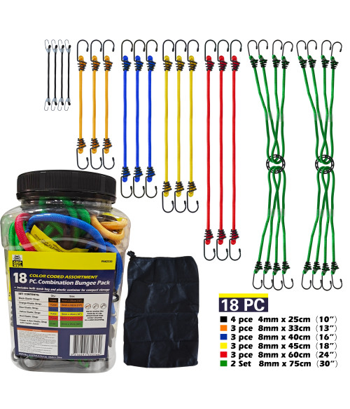 Elastic Bungee Strap Assorted 18pk The Gripwell Elastic Bungee Strap Assorted Pack is a versatile and durable solution for securing loads, organizing items, or outdoor activities. With a variety of sizes and colours, this 18-piece pack ensures you have the right strap for every task.