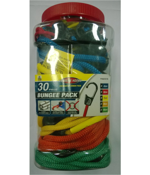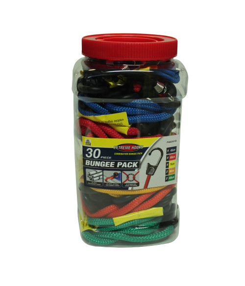 30pcs Extreme Bungee Set The Gripwell Extreme Bungee Set is a versatile and heavy-duty solution for securing loads, fastening tarps, and a variety of general and recreational uses. Built for durability, these bungees are up to 4 times stronger than conventional bungee cords, featuring heavy-duty injection-moulded hooks and a wide assortment of sizes for multiple applications.