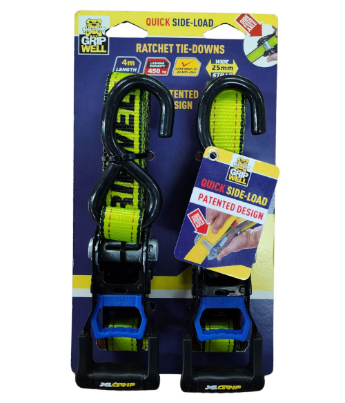 Gripwell 2PC Ergo Ratchet Tie Down is engineered with a patented side-loading ratchet system, offering 4x faster loading and effortless tensioning for quick, safe, and secure cargo fastening. These tie-downs are built to heavy-duty standards, making them ideal for securing loads in trailers, utes, and roof racks.