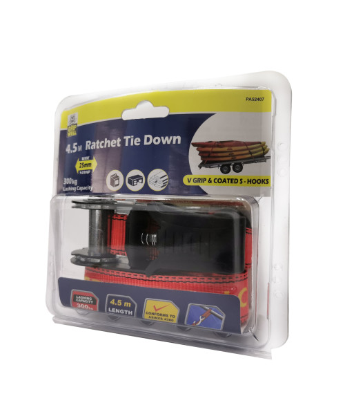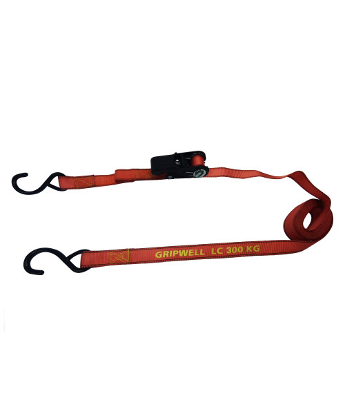 Ratchet Tie Down 4.5m (300kg LC) The Gripwell Ratchet Tie Down is a reliable and efficient solution for securely fastening loads during transport. With durable construction and user-friendly features, this tie-down ensures safe and convenient operation.