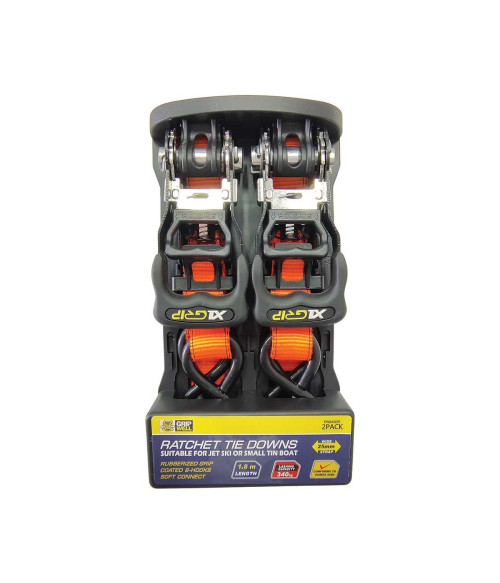 2pc Ratchet Tie Down 25mm x 1.8m (340kg LC) The Gripwell Ratchet Tie Down is a dependable and versatile solution for securely fastening small loads, such as jet skis, motorcycles, and small boats. Designed with high-quality materials and user-friendly features, this tie-down is perfect for ensuring safe and secure transportation.