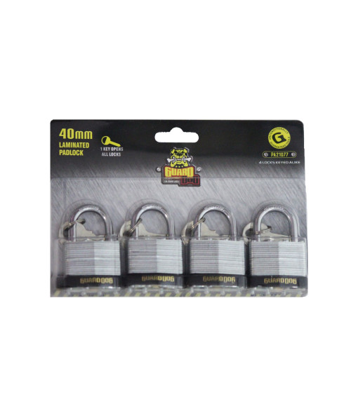 Gripwell Laminated Padlock made using plates of special hardened steel and a hardened shackle. Ideal for tool boxes, lockers or bicycle chains. Effective as chrome plating which almost makes these locks as resilient as stainless steel but much stronger. Laminated padlock with a hardened steel shackle for extra cut resistance. Corrosion resistance, protection to the weather. Padlocks are supplied with its own set of 4 keys. Size: 40 mm.