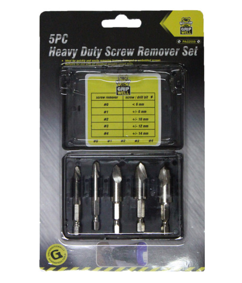 Gripwell Screw Extractor Set is made from heavy duty material. It has high durability and strength. This tool is ideal for quickly removing broken, damaged or embedded screws. Comes in pack of 5.