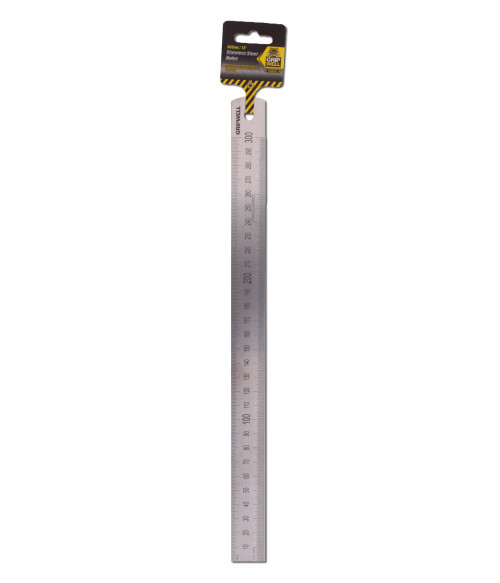 Gripwell Stainless Steel Rule is made of hardened stainless steel that does not bend but is flexible. Graduations on both upper and lower edges with numerical markings in centre. One square end and one round end with hanging hole. Thickness: 0.5mm, Graduation are in METRIC on side and in INCHES on the other. The graduations are embossed into the metal so they won't fade over time. 12-inch/300mm.